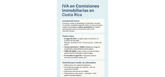 Si está por vender su propiedad en Costa Rica, recuerde: la comisión inmobiliaria paga IVA (13%) y la venta se acelera cuando lo acompaña un asesor profesional (no “pirata”) que fija precio correcto, documenta todo y evita sorpresas fiscales.